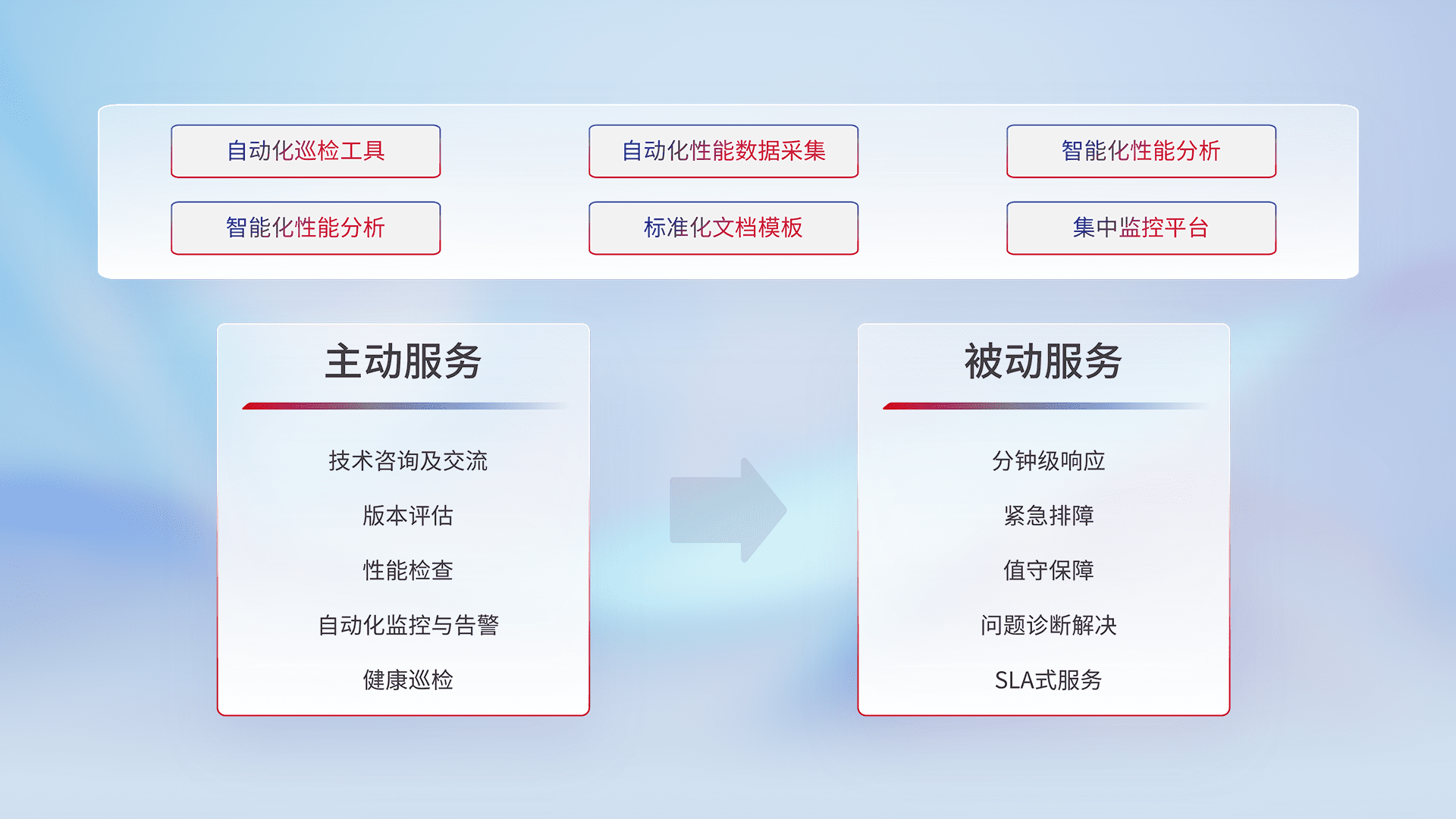 智能化工具和标准化文档,,,,保障服务质量,,,提供主动服务(包含技术咨询、、、、版本评估、、性能检查、、自动化监控与告警、、健康巡检)和被动服务包含(分钟级响应、、、、紧急排障、、、、值守保障、、、问题诊断解决、、SLA服务)。。。。
